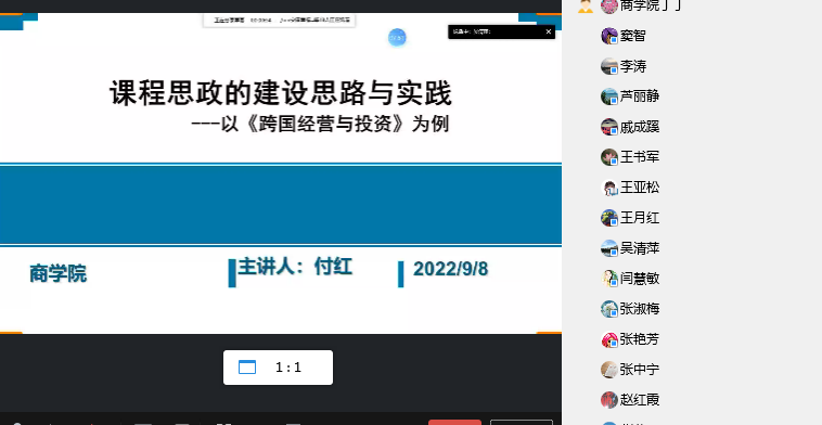 2022年9月9日下午,商公司在线举办了一期教学沙龙活动。活动主题是《课程思政建设思路与实践—以《跨国经营与投资》为例》,由国际经济与贸易系教师付红老师主讲。参加教学沙龙活动的来自各个公司的教师共计50余人。