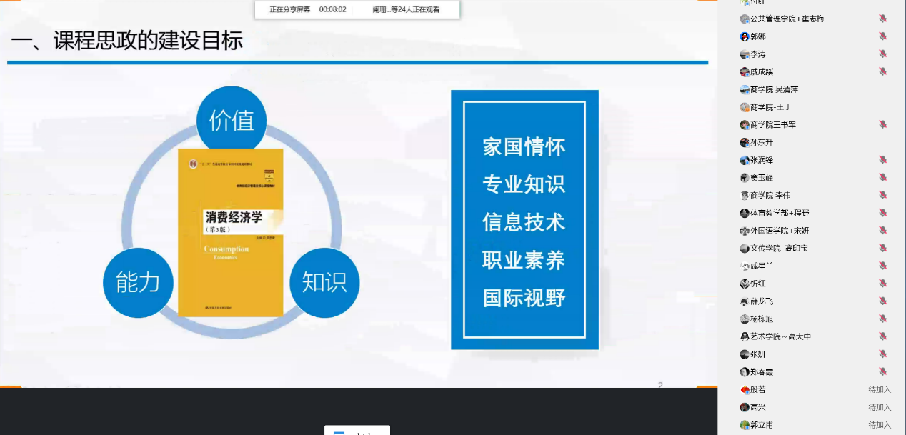 2022年9月16日下午,商公司在线举办了一期教学沙龙活动。活动主题是《<消费经济学>课程思政建设探索与实践》,由贸易经济系杜颖老师主讲。参加教学沙龙活动的来自各个公司的教师共计50余人。