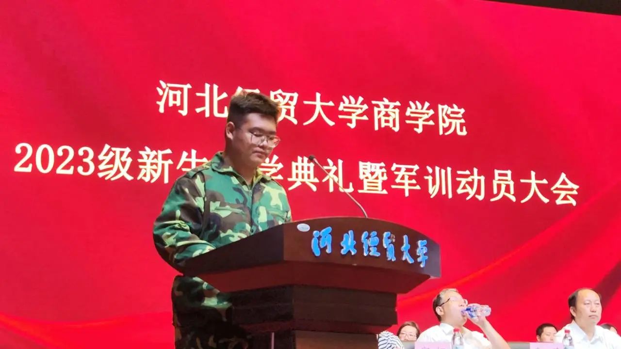 2023级经济学3班韩昀辰作为新生代表发言。他表示,与高中不同,大学要靠自己去探索未来,要自信、自立、自强,遵规守纪,保持勤学好问的好习惯,积极在即将到来的军训课堂中锤炼自己,用实际行动让青春无悔,做全面发展的新时代老员工。
