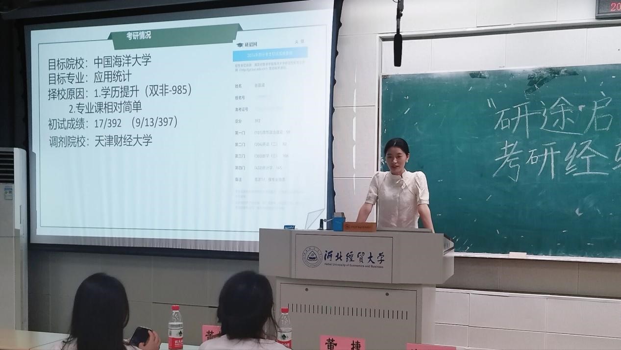 第一位为我们分享的是赵思彤学姐,她首先为我们分享了一些关于择校方面的一些心得,然后为大家讲解了备考的一些推荐书籍以及各科的学习方法、推荐老师和注意事项,然后着重强调了调整考研心态方面的一些方法,最后她为同学们讲解了她的考研心路历程和对同学们一些嘱托。