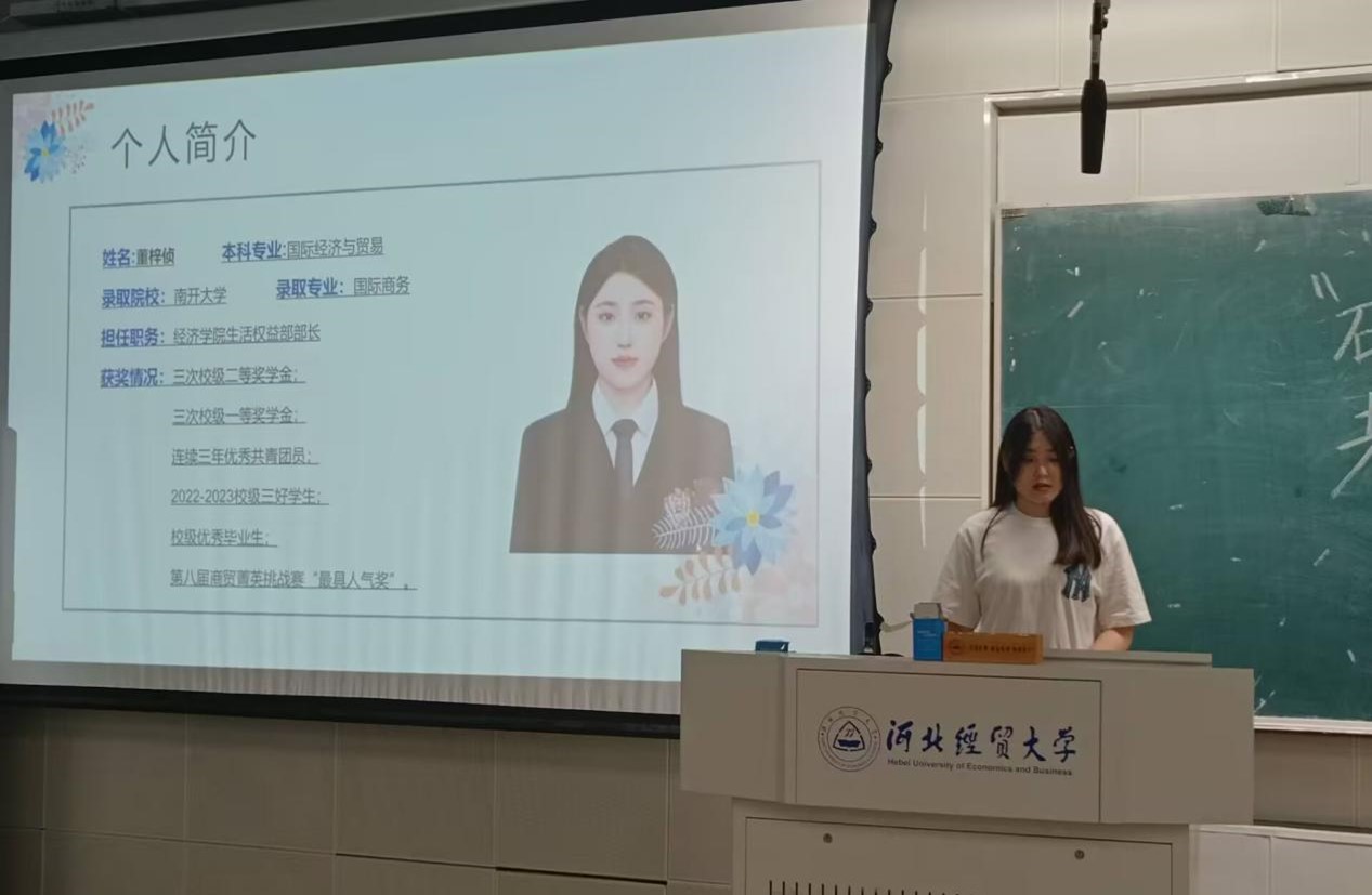 第三位分享的是董捷学姐,作为推免至上海大学的优秀学姐,她强调了先思考目标再高效执行最后复盘总结的逻辑顺序,让我们对于如何学习怎样学习有了更加科学清晰的认知,同时也强调了要走出个人舒适圈,学习之余多出去走走,寻找课本之外的知识。