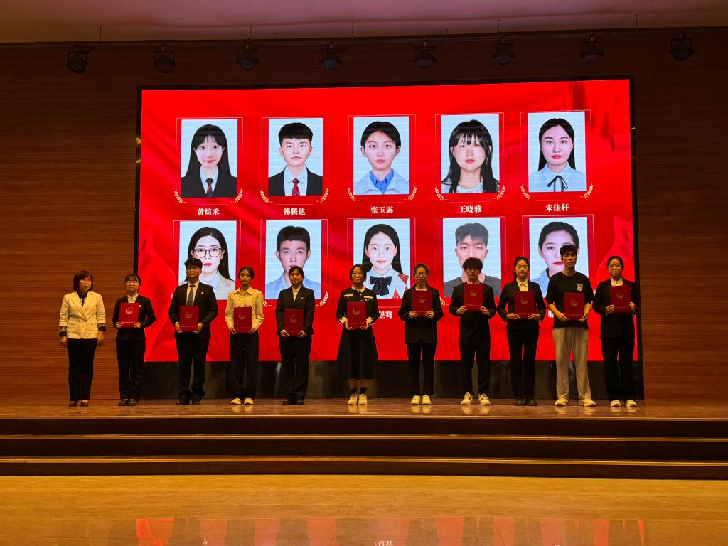 20级经济学一班邵项杰(左2)、21级经济学2班马珺娴(左4)上台领奖