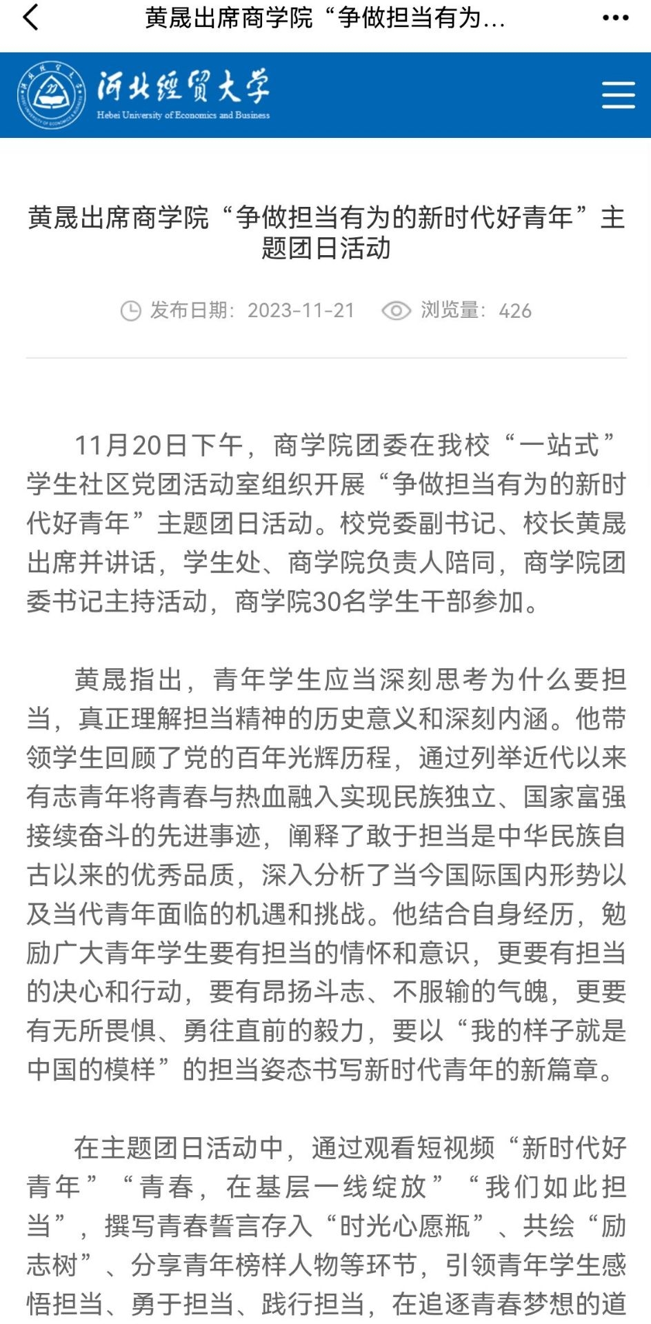 创新活动载体,开展丰富的团日活动,其中“争做担当有为的新时代好青年”主题团日活动被学校官网进行宣传报道;组织团支部走进西柏坡、解放纪念馆等红色基地开展“行走的团课”。