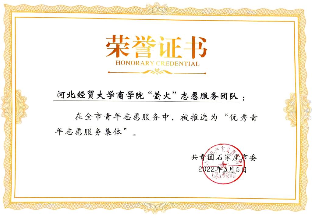 深耕“萤火”志愿服务项目,拓宽志愿服务活动领域。立足专业特色,创新开展“筑梦财商”经济学小课堂品牌志愿服务活动,为小员工讲授“财商思维培育”精品课程,2023年获校级优秀志愿服务项目。“萤火”志愿服务团队连续两年获得石家庄市优秀青年志愿服务集体。