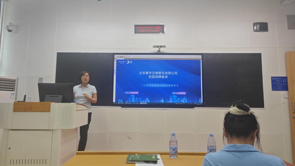 5月28号下午,公司于b112举办校园招聘宣讲会,本次招聘宣讲会特邀北京嘉宇沃德展览有限公司与河北富宸地材有限公司两家企业进行宣讲,太阳成城集团就业联络员崔靖然参加本次活动。