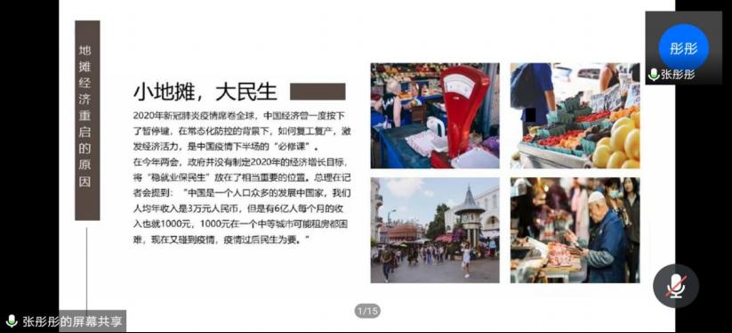 参加活动的同学分别就自己感兴趣的话题对身边的现象进行了经济学分析。吴佳钧同学以“为什么控制不住房价”为主题,谈及上海等一线城市房价较高的现状,并详细分析其原因。张丹彤同学积极联系当前疫情防控的实际,以“大力发展地摊经济”为主题展开了精彩的分享……张卉卓同学以日常最常接触的超市为主题,为我们讲述了有关超市经济的知识,使我们对身边的经济现象有了更加深刻的认识。