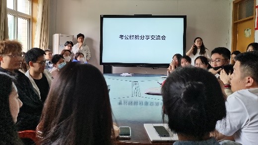 交流会上,侯祥杰等同学首先从选岗到笔试再到面试对公务员考试的流程做了简要介绍,并详细介绍了国税局、银监会岗位的考试内容和未来的职业发展前景,然后讲解了备考过程中的各项科目的学习规划和考试技巧,并结合个人的备考生活经验,分享如何平衡好科研任务、毕业论文、备考学习三者之间关系。分享结束后是讨论环节,同学们就备考相关问题踊跃提问,并得到了耐心解答和暖心鼓励。