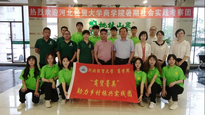 “商贸菁英”实践团第一站是走进秦皇岛桃花泉山泉水有限公司,双方在公司总部隆重举行校企合作签约仪式,并成功设立“创新创业王立波员工基金”。