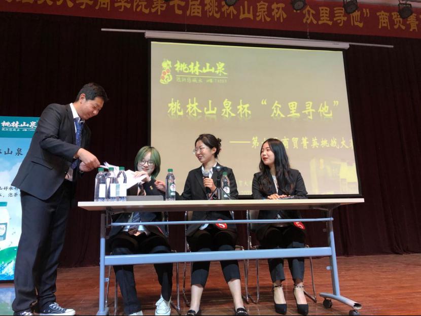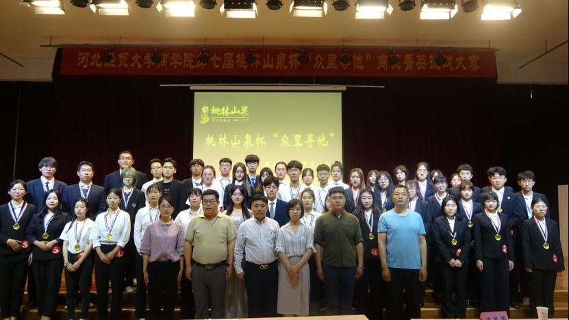 6月7日下午,由商公司团委主办、商公司员工会文公部承办的第七届桃林山泉杯“众里寻他”商贸菁英决赛在老员工活动中心3号厅举办。比赛邀请到商公司党委书记马兵林、秦皇岛桃林山泉水有限公司董事长王立波、商公司党委副书记侯彦利、秦皇岛桃林山泉石家庄办事处总经理梁恩萌、商公司经济系教师赵培红、商公司电子商务系教师和彦鹏、商公司团委书记路荣出席并担任本次比赛的评委。