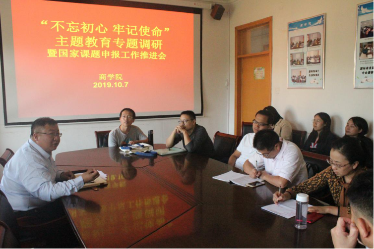 为扎实有效地开展“不忘初心、牢记使命”主题教育,切实掌握一线教职工在科研工作中面临的实际问题,着力提高公司国家级课题申报质量,促进公司科研实力迈向新高度。10月7日,商公司在西会议室召开主题教育专题调研暨国家课题申报工作推进会。商公司20余名教师参加。会议由刘振滨副经理主持。