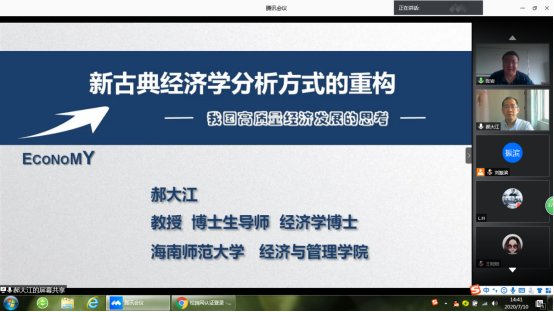 7月10日,海南师范大学经济与管理公司博士生导师郝大江教授应商公司邀请,于线上作了题为“我国高质量发展的经济学思考:新古典经济学范式的中国重构”的学术报告。报告由商公司副经理刘振滨主持,公司30余名师生参加。