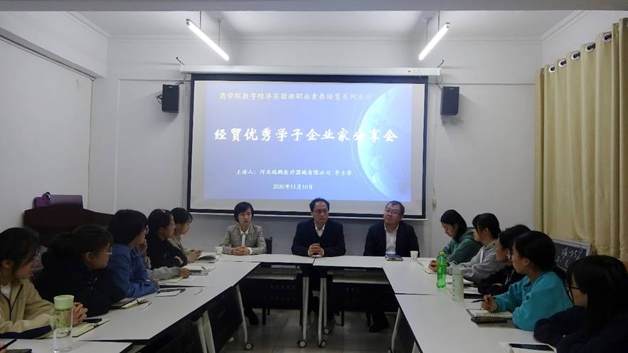 11月10日下午4点,商公司在三办中会议室举行经贸优秀学子企业家分享会。商公司经理王小平、河北瑞鹤医疗器械有限公司人力资源总经理李士章及数字经济实验班部分同学参加,分享会由商公司党委副书记侯彦利主持。