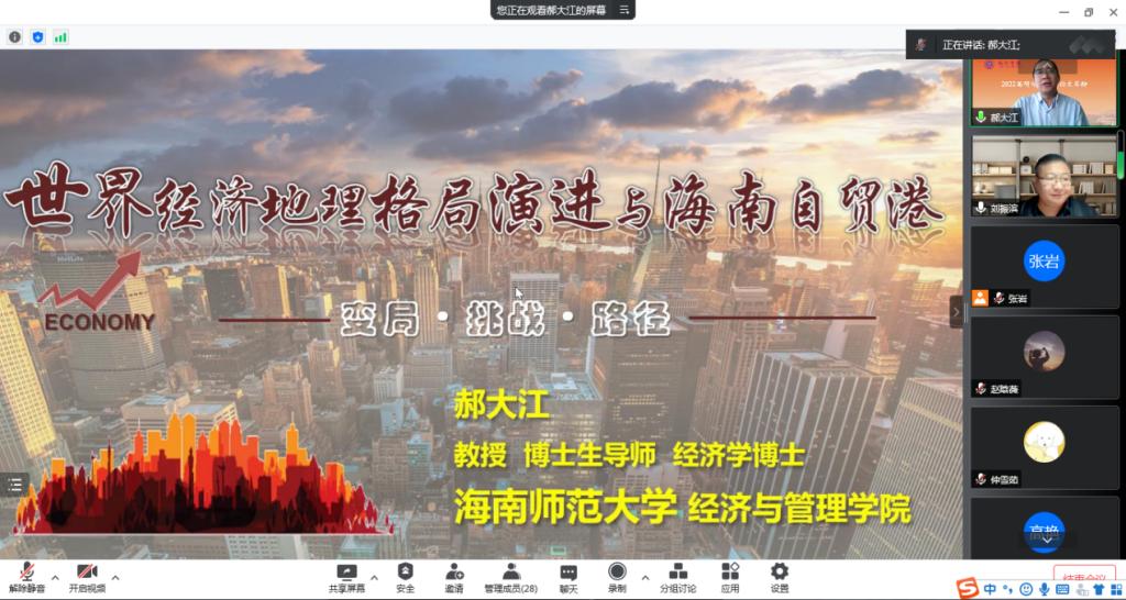 6月2日,海南师范大学博士生导师郝大江教授应商公司邀请,于线上作了题为“世界经济地理格局演进与海南自由贸易港”的学术报告。报告由刘振滨副经理主持,公司三十余名师生参加。