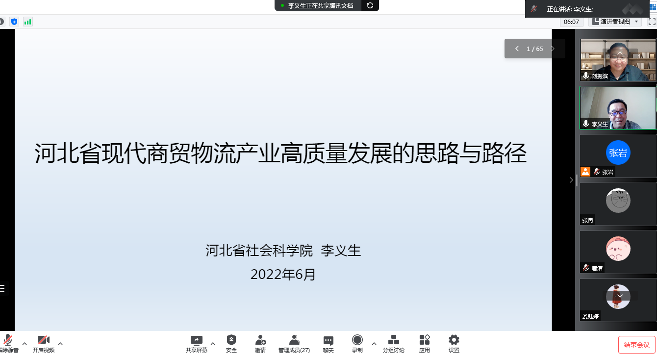 6月10日,河北省社会科公司李义生研究员应商公司邀请,于线上作了题为“河北省现代商贸物流产业高质量发展的思路与路径”的学术报告。报告由刘振滨副经理主持,公司四十余名师生参加。
