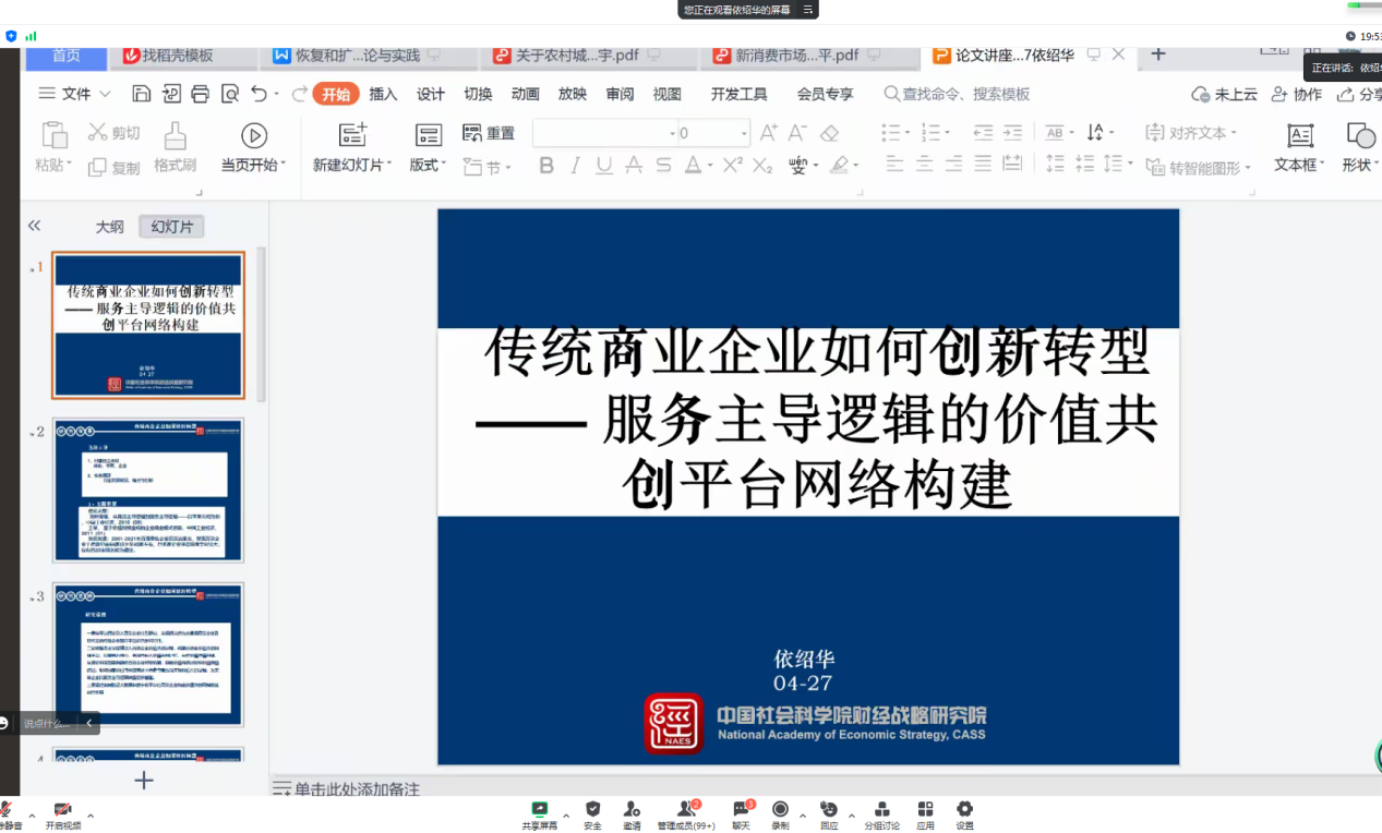 4月27日,中国社会科公司财经战略研究院市场流通研究室主任、博士生导师依绍华研究员应商公司邀请,于线上作了题为“传统商业企业如何创新转型——服务主导逻辑的价值共创平台网络构建”的学术报告。报告由王小平教授主持,百余名师生参加。