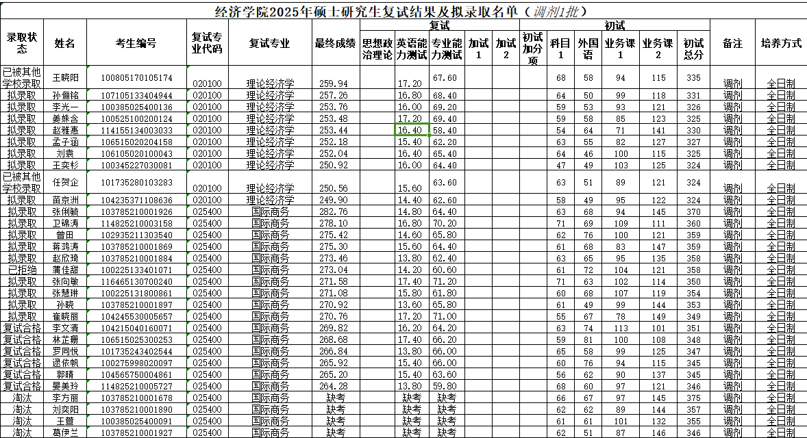 2025年硕士研究生复试结果及拟录取名单(调剂1批)