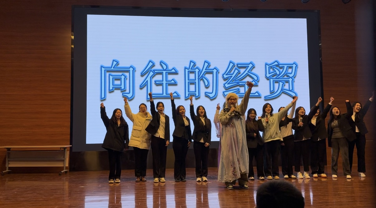 团委办公室带来两个节目:群舞《重生之我在经贸当瑶子》、小品《向往的经贸》。舞蹈成员们用炫酷的舞蹈、整齐划一的动作带动了联谊晚会的全场气氛,使得台下的观众掌声雷动。小品以第一视角演绎了大一新生在经贸的生活学习中的典型片段,引起观众的深深共鸣。成员们用他们精湛的演技以及诙谐的台词和流行的热梗赢得台下的阵阵笑声和片片掌声,几位男生的反串可真是将女性特征及魅力发挥得淋漓尽致。让我们明白唯有努力坚持,才是向往的经贸。